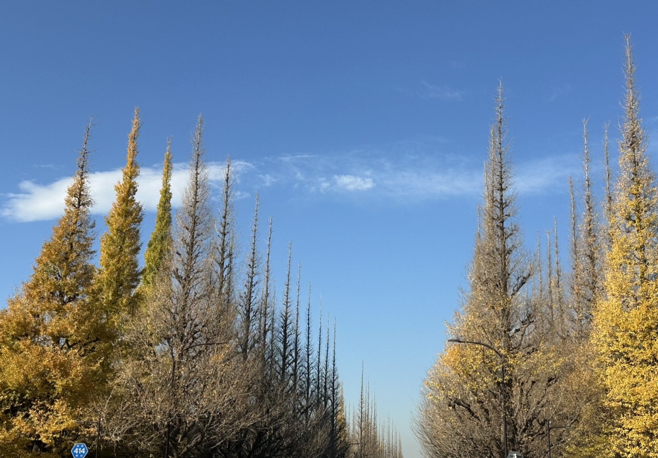 神宮外苑のイチョウ並木が、少しずつ冬の表情を見せはじめました。